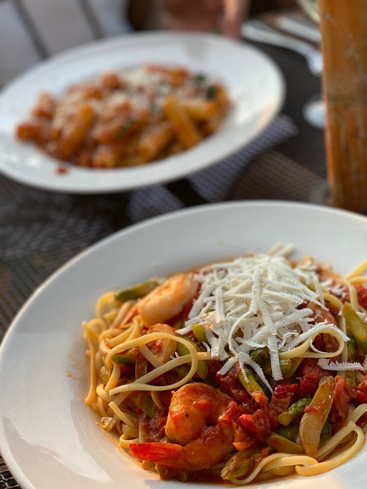 linguine sauteed with shrimps, asparagus, sun dried tomato, and shaved ricotta, in a light marinara sauce
