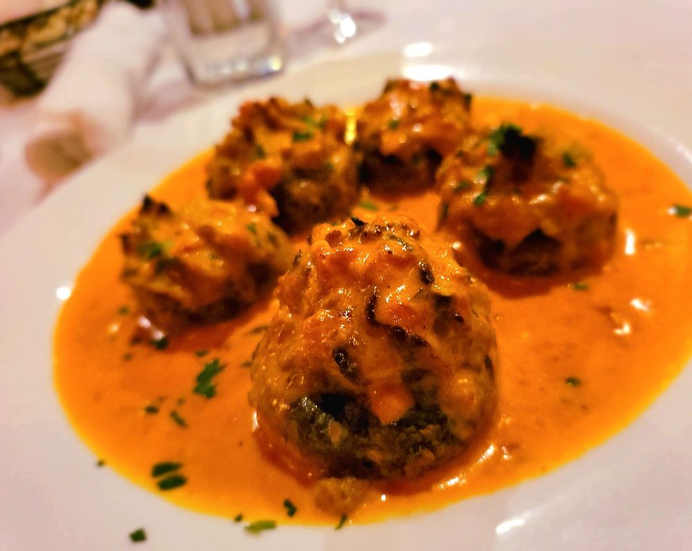 baked orecchiette with miniature meatballs and mozzarella in a tomato sauce